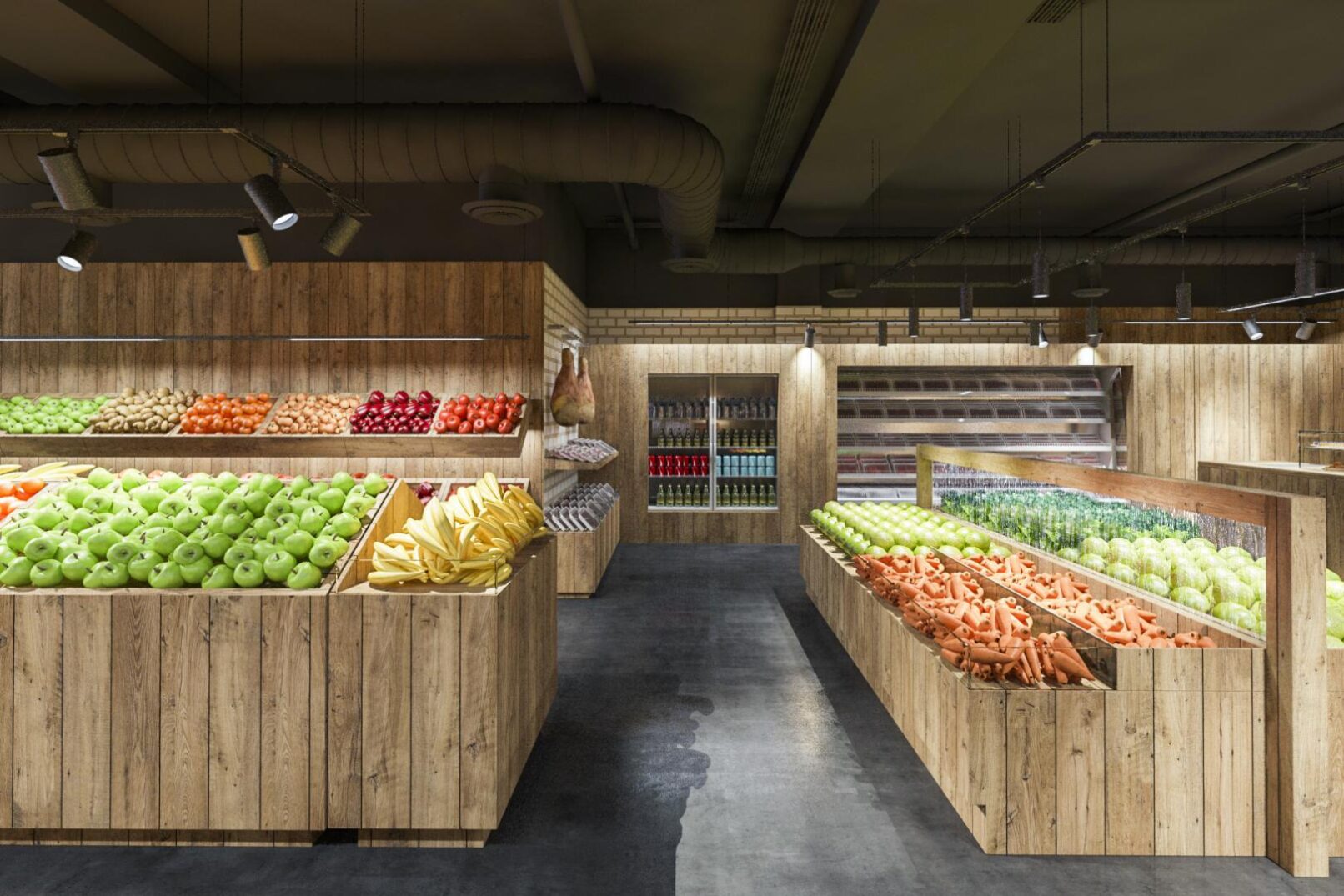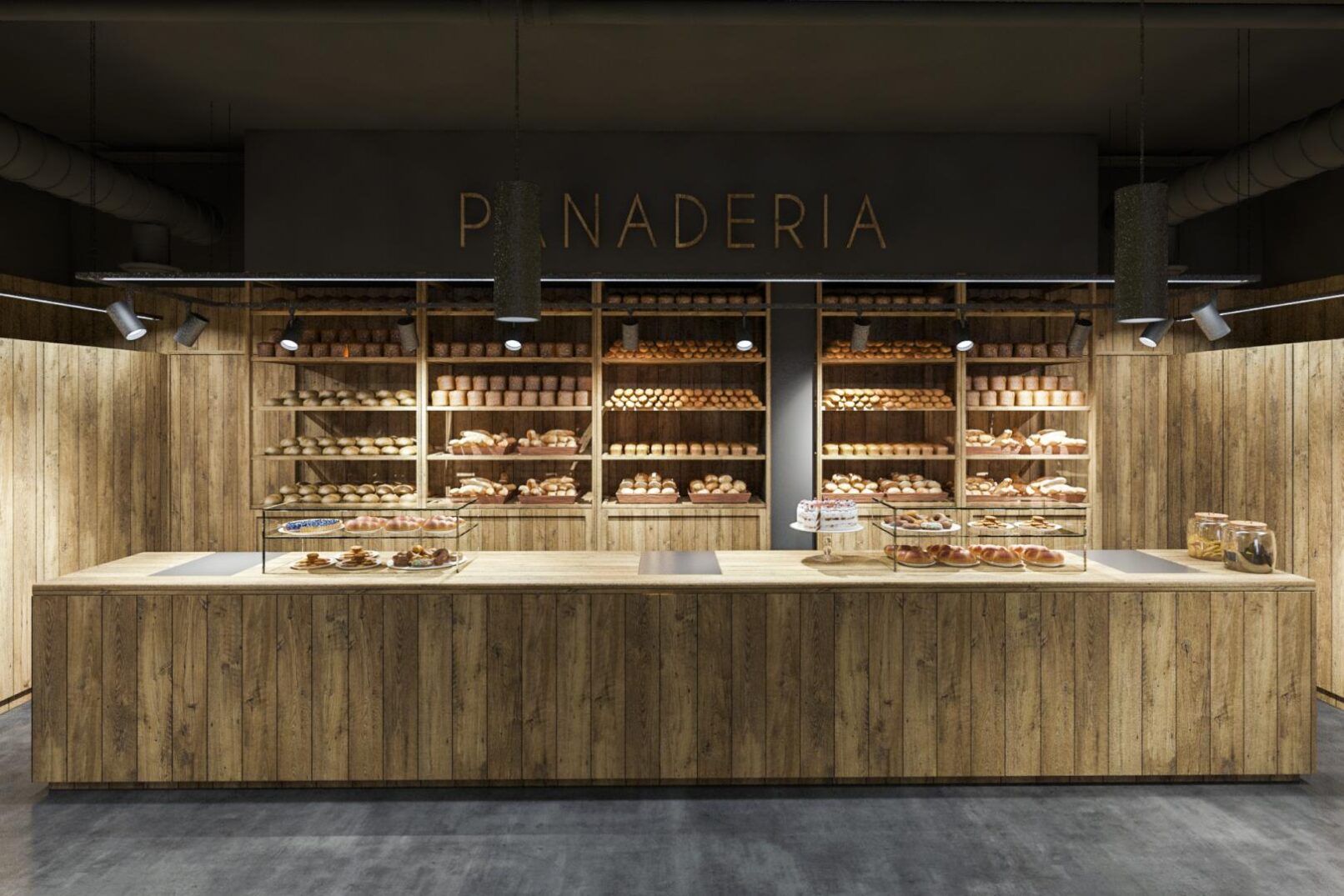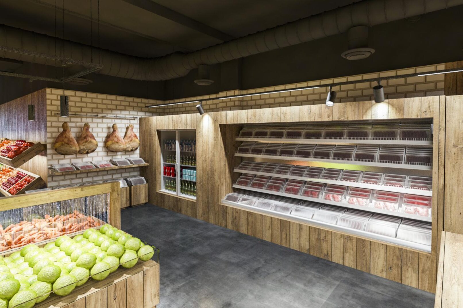 Deseñamos un local moi industrial, de madeira , instalacións vistas, e solado de formigón. Sobre todo para que destacase o Produto.