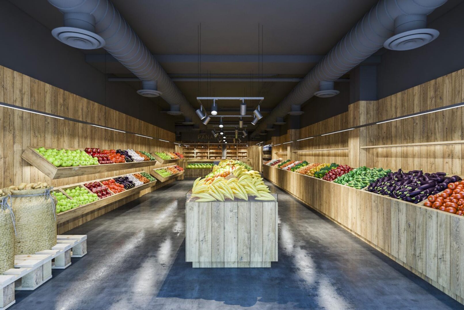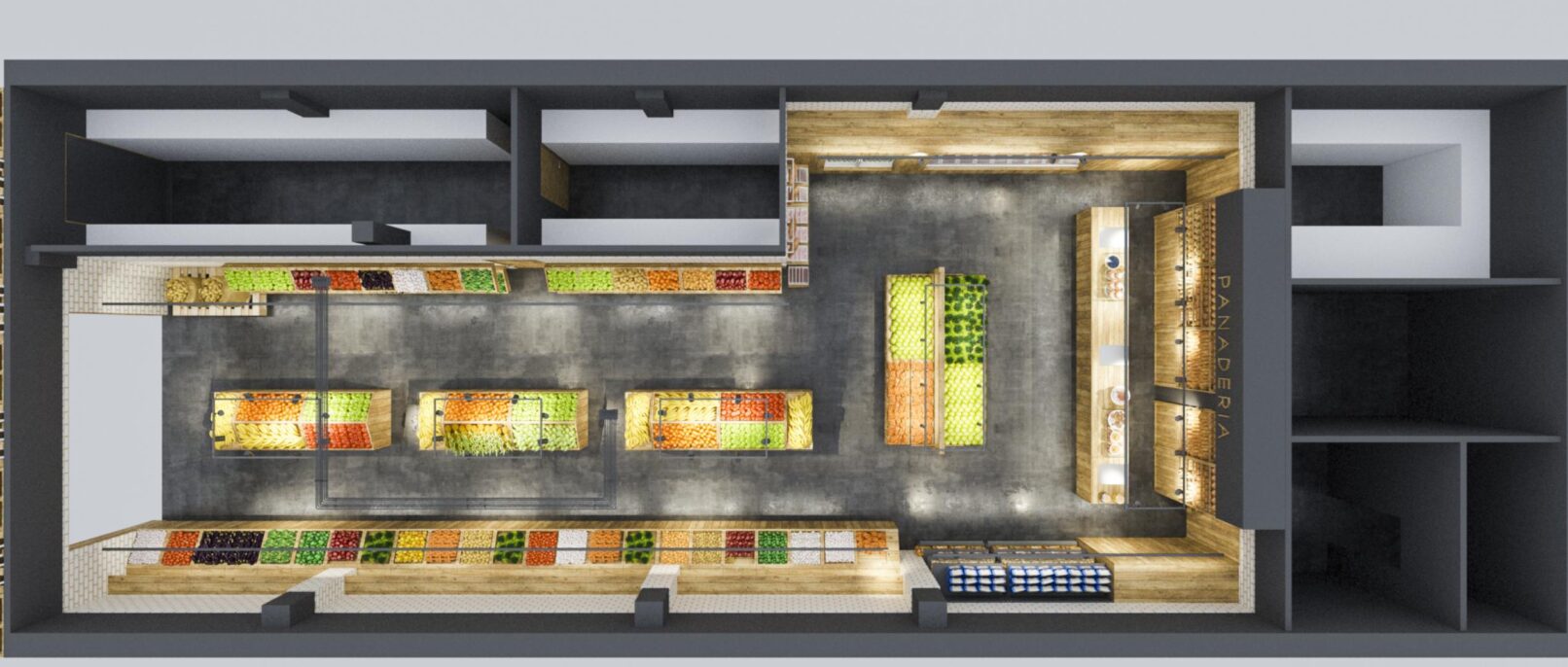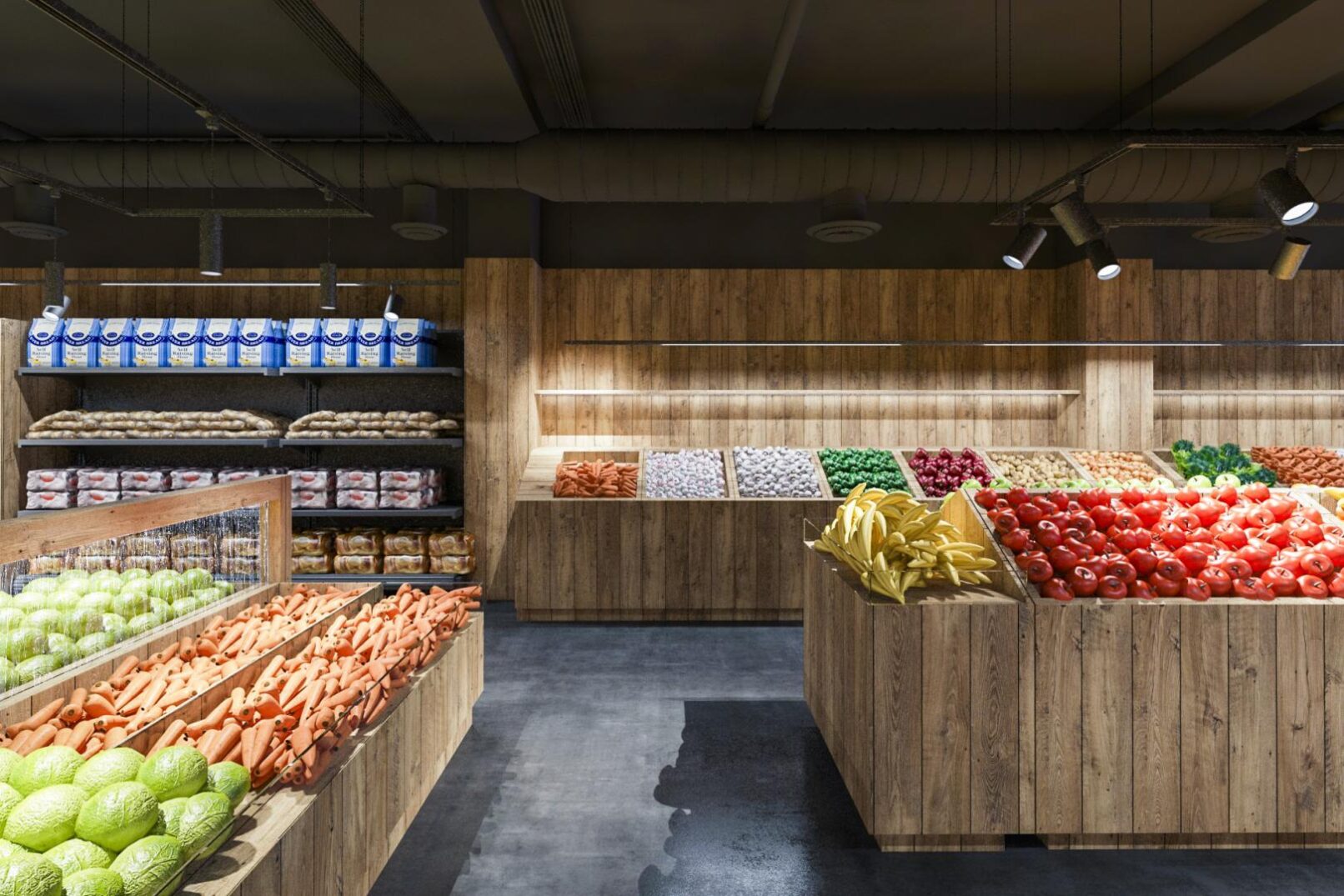 Deseñamos un local moi industrial, de madeira , instalacións vistas, e solado de formigón. Sobre todo para que destacase o Produto.