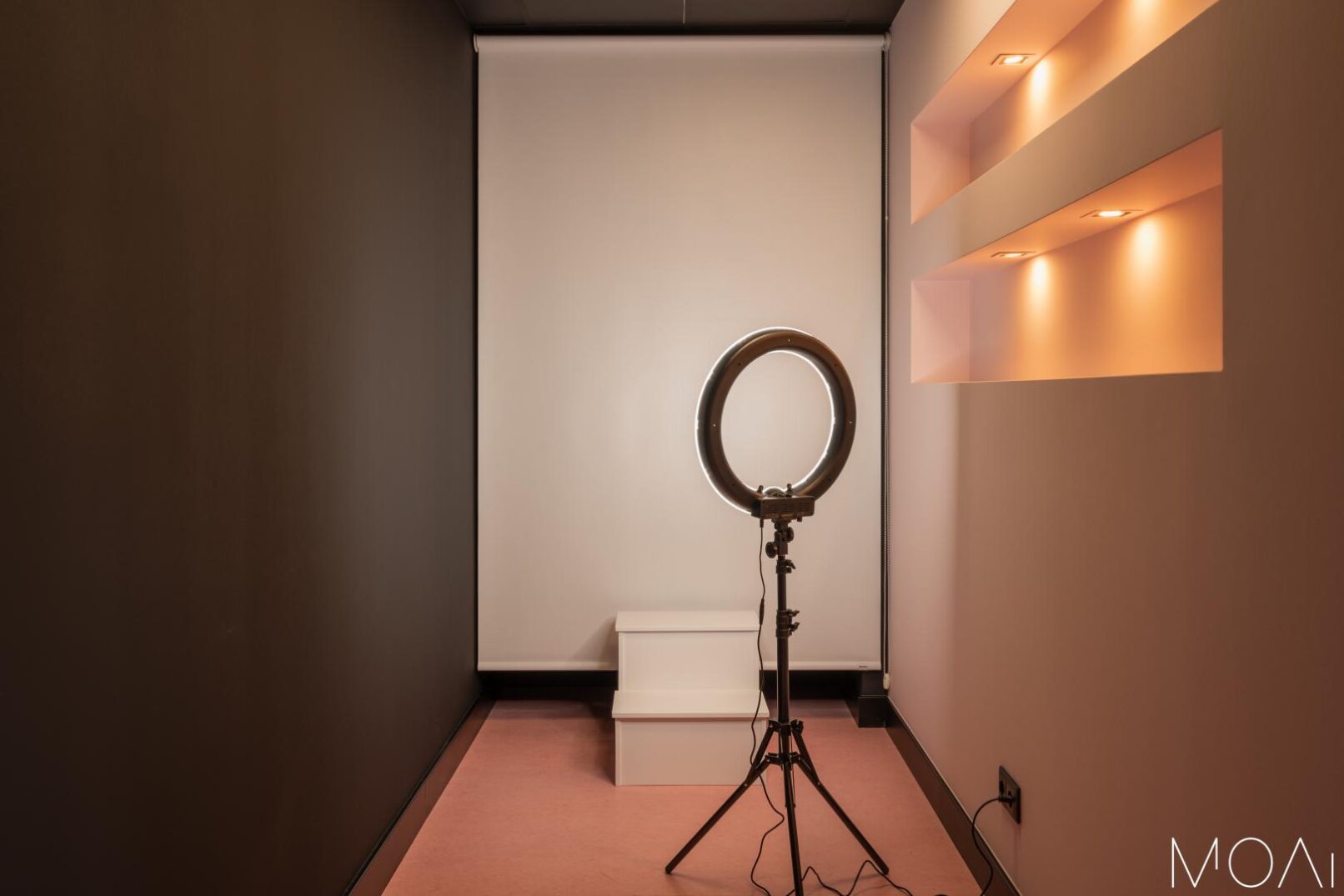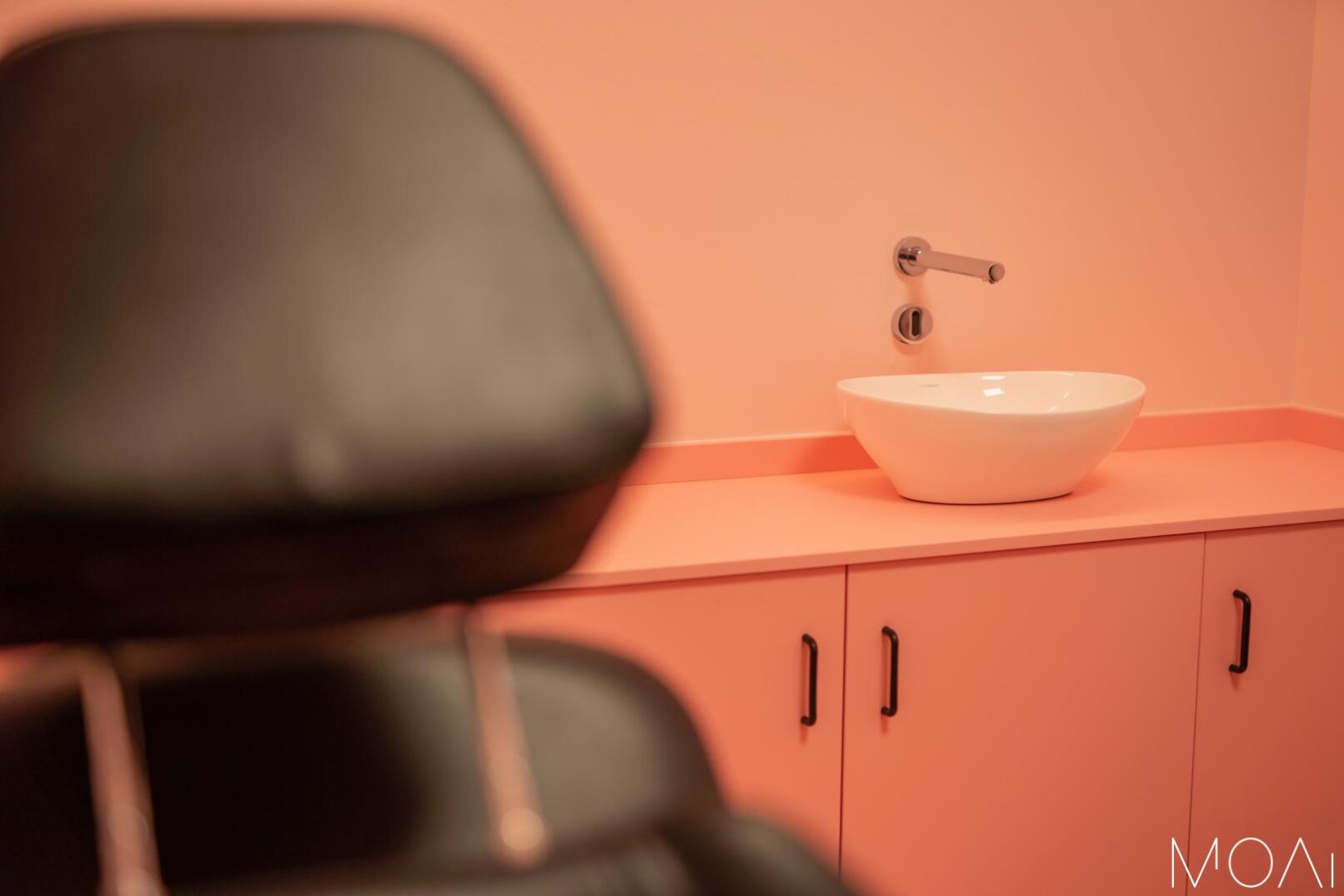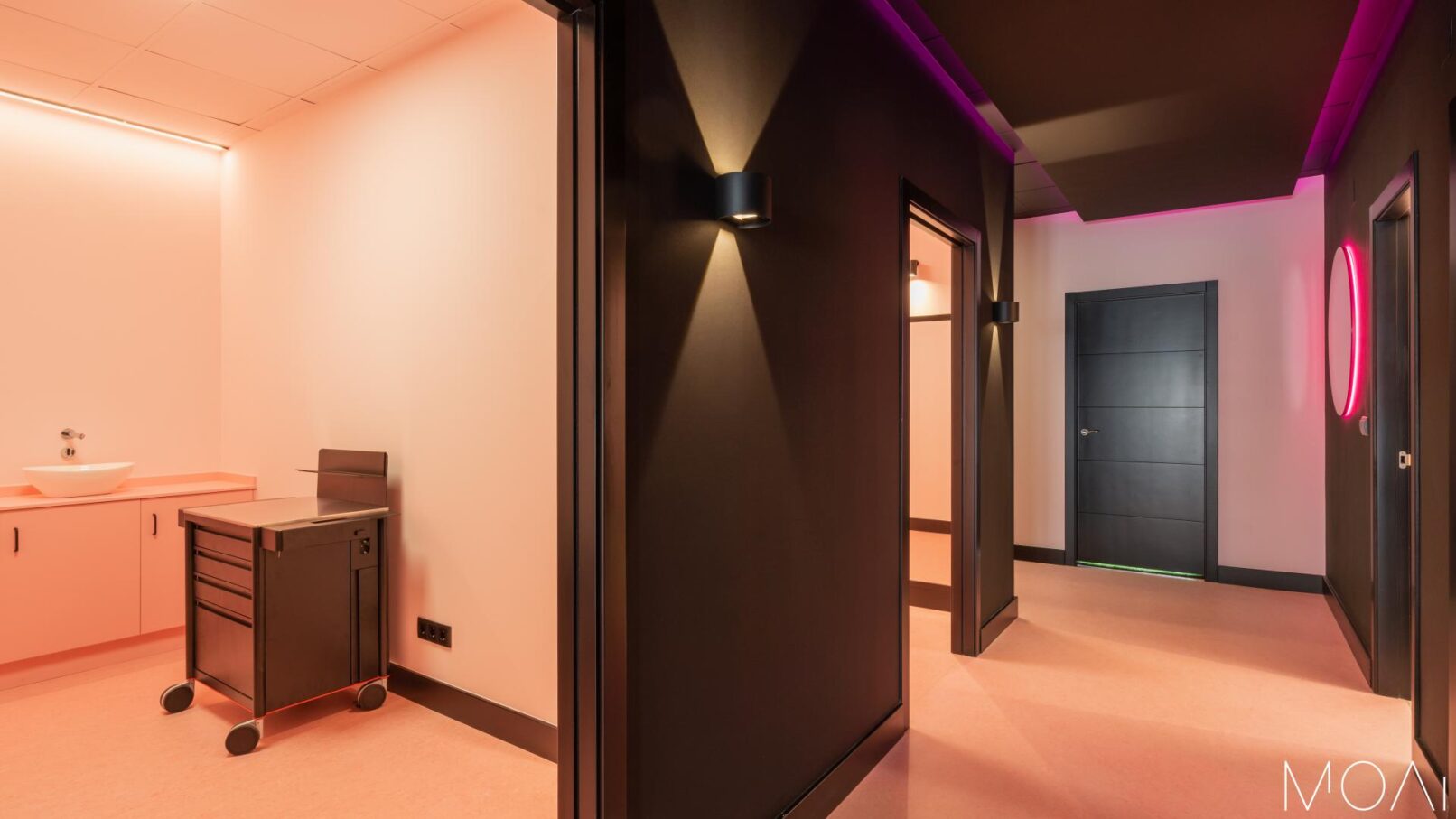 Unha vez que nos adentramos no local, son as cores negro e rosa as principais protagonistas, alternadas no chan, nas paredes e nos diferentes elementos de mobiliario e decoración. O conxunto das cores nos diferentes planos, a iluminación sutil en determinados puntos e máis chamativa noutras zonas coma no corredor ou no baño, xeran un espazo cómodo e agradable impregnado dunha sensación que incita a disfrutar da experiencia.